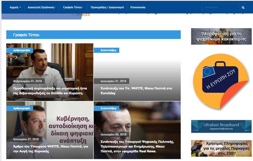 Ποτέ η εκτόξευση αυτών των δορυφόρων δεν έγινε «μείζον εθνικό θέμα», παρά μόνο όταν δημιουργήθηκε το υπουργείο Ψηφιακής Πολιτικής, Τηλεπικοινωνιών και Ενημέρωσης και τοποθετήθηκε σ' αυτό ο «εκπεσών άγγελος» Νίκος Παππάς, ο πρώην Διόσκουρος του Τσίπρα, μετά την εκδίωξή του από το μέγαρο Μαξίμου, εξαιτίας του φιάσκου με τις τηλεοπτικές άδειες (ίσως και άλλων «ιστοριών»). Ο Παππάς είναι πλέον δευτεροκλασάτος υπουργός και πασχίζει με νύχια και με δόντια να μείνει στον αφρό, χρησιμοποιώντας τις διασυνδέσεις που από τη θέση του έχει στα ΜΜΕ. Δείτε στη φωτογραφία την πρώτη σελίδα του σάιτ του υπουργείου και θα καταλάβετε. Στην κορυφή ένας μεγάλος χώρος στον οποίο παρουσιάζονται συνεντεύξεις και αρθρογραφία του Παππά στα ΜΜΕ. Ολα τα υπόλοιπα σε δεύτερη μοίρα.