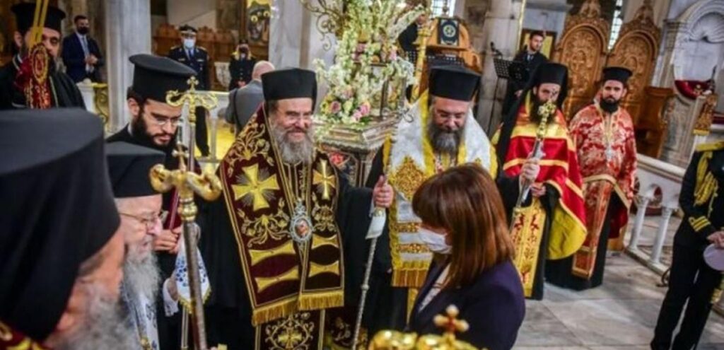 Δείτε τη φωτογραφία. Η πρόεδρος της Δημοκρατίας, φορώντας μάσκα, πλησιάζει την ομήγυρη των αμάσκωτων ρασοφόρων. Οτι οι δεσποτάδες ήταν αποφασισμένοι να προκαλέσουν φάνηκε από το γεγονός ότι μπήκαν εν χορώ στην εκκλησία χωρίς κανένας τους να φοράει μάσκα ούτε στον εξωτερικό χώρο. Εστειλαν κάποιον να ψιθυρίσει στ’ αυτί του επικεφαλής τους (ο Ανθιμος ήταν), ότι οι επίσημοι θ’ αποχωρήσουν αν δε φορέσουν όλοι τους μάσκες; Οχι μόνο δεν έστειλαν, αλλά έμειναν εκεί μέχρι το τέλος και παρακολουθούσαν με (προσποιητή ή ειλικρινή) κατάνυξη το σόου των αμάσκωτων ρασοφόρων.