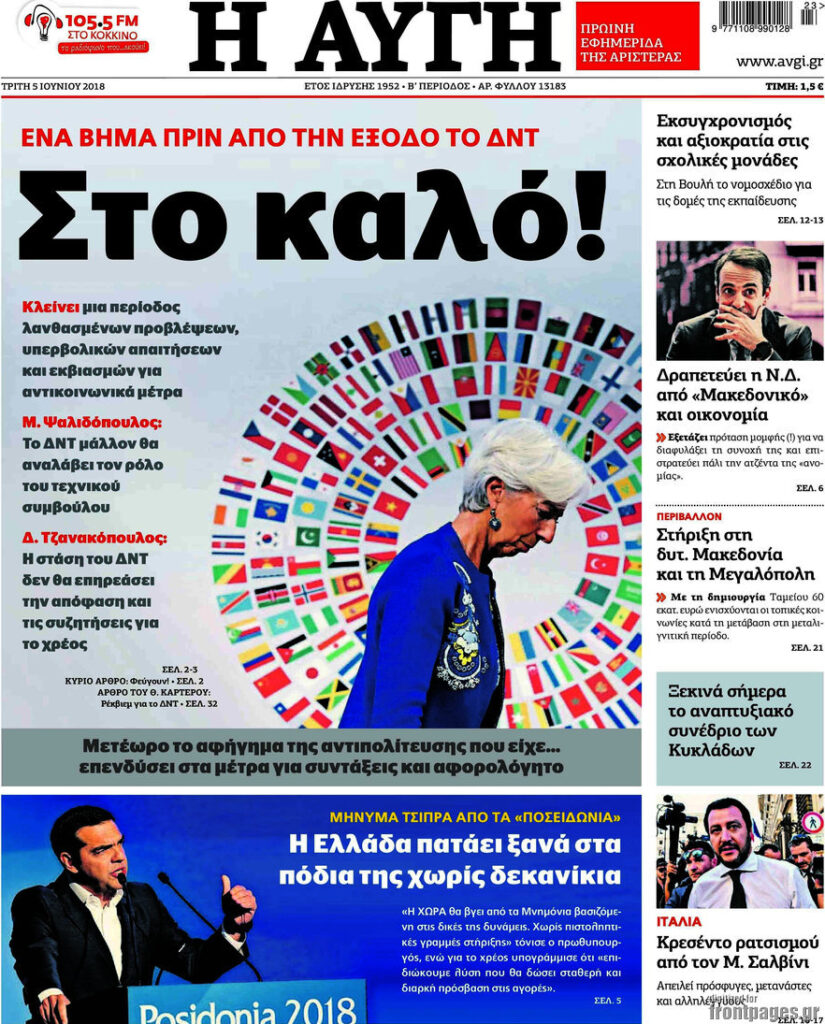 Πανηγύριζε η «Αυγή» την περασμένη Τρίτη: «Ενα βήμα πριν από την έξοδο το ΔΝΤ – Στο καλό!». Κι από κάτω «ζωνάρι» το… μεγάλο μήνυμα: «Μετέωρο το αφήγημα της αντιπολίτευσης, που είχε… επενδύσει στα μέτρα για συντάξεις και αφορολογητο».