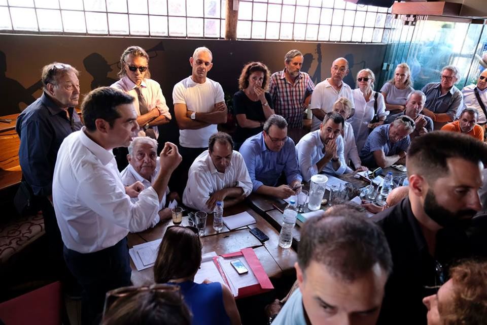Το σόου ήταν άψογα σκηνοθετημένο. Περιλάμβανε περιοδεία στα καμένα (με τα πρόσωπα παγωμένα σε έκφραση θλίψης), στρατιά ασφαλιτών και κλακαδόρων (ώστε να εξουδετερώσουν με τα χειροκροτήματα τυχόν διαμαρτυρίες πληγέντων – οι οποίες δεν αποφεύχθηκαν, όμως κρατήθηκαν σε ελεγχόμενο πλαίσιο) και μετά «σύσκεψη» σε καφενείο, όπου έγιναν οι ανακοινώσεις. Ο στόχος ήταν να δειχτεί πρώτο ότι ο πρωθυπουργός ενδιαφέρεται και εποπτεύει προσωπικά τους υπουργούς του και τις υπηρεσίες και δεύτερο ότι ο Τσίπρας δε φοβάται την επαφή με το λαό, δεν έχει λόγο να πηγαίνει κρυφά οπουδήποτε. Επρεπε, δηλαδή, να σβηστούν οι καταστροφικές για την εικόνα της κυβέρνησης εντυπώσεις του πρώτου καιρού και ν' αντικατασταθούν με καινούργιες.