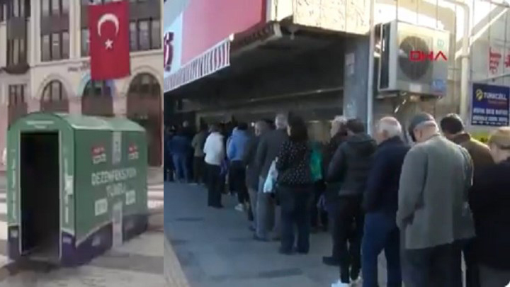 ► Πρώτα τους έστειλε στις ουρές για ν’ αγοράσουν κολόνια λεμόνι χύμα (δεξιά φωτογραφία), που εξοντώνει τον κοροναϊό. Για να γίνει μάλιστα πιστευτός ότι έχει βρει το φάρμακο που θα προστατεύσει την Τουρκία από την πανδημία, απαγόρευσε τις εξαγωγές λεμονιών. Καμάρωνε κιόλας που κάποιοι δικοί του βρήκαν το κόλπο με το δημόσιο ψεκασμό ατόμων (αριστερή φωτογραφία). Οταν η πανδημία άρχισε να εξαπλώνεται, ανακοίνωσε πανικόβλητος γενικό «λοκ ντάουν» 48 ωρών σε 20 μεγάλες πόλεις, που θα ξεκινούσε στη 1 μετά τα μεσάνυχτα της Παρασκευής προς Σάββατο. Κι έγινε το έλα να δεις, καθώς ο κόσμος ξεχύθηκε στους δρόμους πεζή και εποχούμενος κι άρχισε να συρρέει στα σούπερ μάρκετ. Είδαν τον πανικό, είδαν την τεράστια συσσώρευση ανθρώπων στους δρόμους και στα μαγαζιά και τότε θυμήθηκαν να εκδώσουν διευκρινιστική εγκύκλιο, σύμφωνα με την οποία καταστήματα τροφίμων, φούρνοι και φαρμακεία δε θα έκλειναν. Το καθεστώς Ερντογάν αποδεικνύει ότι η πολιτική αντίδραση πάει χέρι-χέρι με την περιφρόνηση προς την ανθρώπινη ζωή.