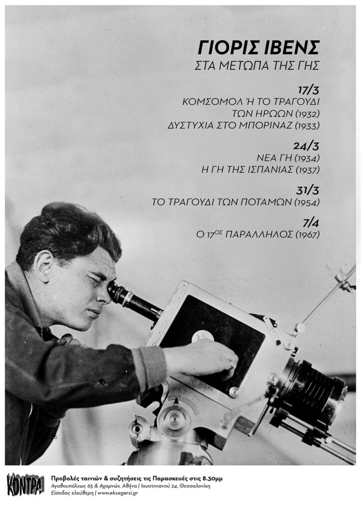 Ενα από τα σημαντικότερα αφιερώματα που έχουν οργανωθεί στο πλαίσιο των βιντεοπροβολών που γίνονται εδώ και πολλά χρόνια, κάθε Παρασκευή, στην «Κόντρα», θα ξεκινήσει την επόμενη Παρασκευή (17 Μάρτη). Ενα αφιέρωμα στον Γιόρις Ιβενς (1898-1989), τον κομμουνιστή κινηματογραφιστή που όργωσε τον πλανήτη αποτυπώνοντας τους αγώνες για την ελευθερία, τα επαναστατικά σκιρτήματα του προλεταριάτου και των λαών, τα μεγάλα σοσιαλιστικά κινήματα.