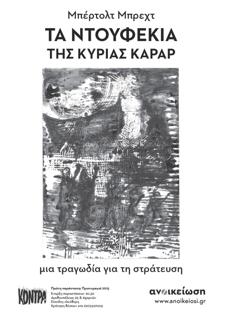 Το κλασικό έργο του Μπέρτολτ Μπρεχτ «Τα ντουφέκια της κυρίας Καράρ», σε μια πρωτότυπη, επικαιροποιημένη παράσταση από την καλλιτεχνική κολεκτίβα «ανοικείωση» επιστρέφει στο κτίριο της «Κόντρας» για ένα δεύτερο κύκλο εννέα παραστάσεων (Σαββατοκύριακα από 31 Οκτώβρη μέχρι 29 Νοέμβρη, εκτός από το Σάββατο 7 Νοέμβρη).