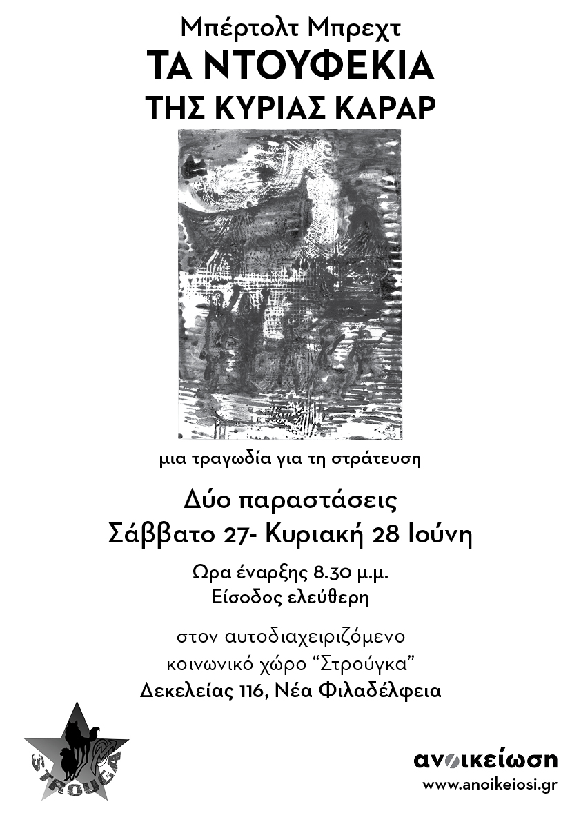 Με δυο παραστάσεις στην αυλή του φιλόξενου στεκιού της «Στρούγκας» ολοκληρώνεται ο πρώτος κύκλος παραστάσεων της ανοικείωσης με το κλασικό έργο του Μπέρτολτ Μπρεχτ «Τα ντουφέκια της κυρίας Καράρ». Μετά την αίθουσα της «Κόντρας», όπου δόθηκαν οι 11 πρώτες παραστάσεις, η παράσταση θα «δοκιμαστεί» σ’ ένα μεγαλύτερο και ανοιχτό χώρο, που εξ ορισμού δημιουργεί νέες προκλήσεις για τους συντελεστές της.
