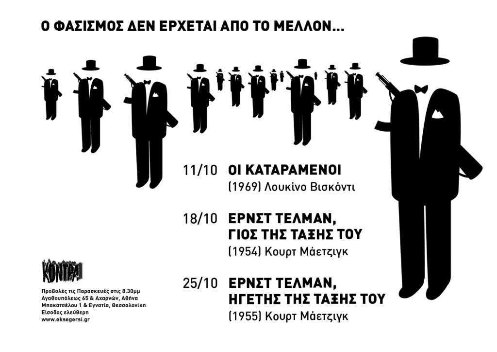 Το κινηματογραφικό αφιέρωμα που ξεκίνησε από χθες στην «Κόντρα» (σε Αθήνα και Θεσσαλονίκη) αυτό το σκοπό θέλει να υπηρετήσει. Μια συζήτηση σε βάθος πάνω στο φασιστικό φαινόμενο, τις κοινωνικές του διαστάσεις και τις πολιτικές παραμέτρους που το καθορίζουν, μέσα από τρεις ταινίες εκ των οποίων η πρώτη βλέπει το φασισμό από την πλευρά της αστικής τάξης, ενώ οι άλλες δύο αποτελούν μια τοιχογραφία της ιστορίας του Μεσοπολέμου στη Γερμανία, με πυρήνα τη δράση του επαναστάτη εργάτη Ερνστ Τέλμαν, ηγέτη του Κομμουνιστικού Κόμματος Γερμανίας. Οι ταινίες είναι η αφορμή, το περιεχόμενό τους είναι το υλικό που μπορεί να τροφοδοτήσει τη συζήτηση που θ’ ακολουθήσει.