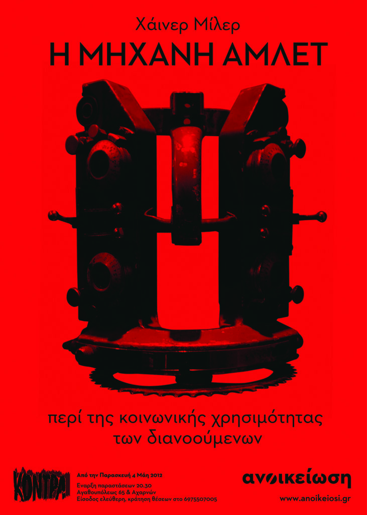 Μετά από προετοιμασία ενάμιση χρόνου, η ανοικείωση, μια καινούργια καλλιτεχνική ομάδα, παρουσιάζει την πρώτη της θεατρική δουλειά: τη Μηχανή Αμλετ του Χάινερ Μίλερ, ως σχόλιο περί της κοινωνικής χρησιμότητας των διανοούμενων.