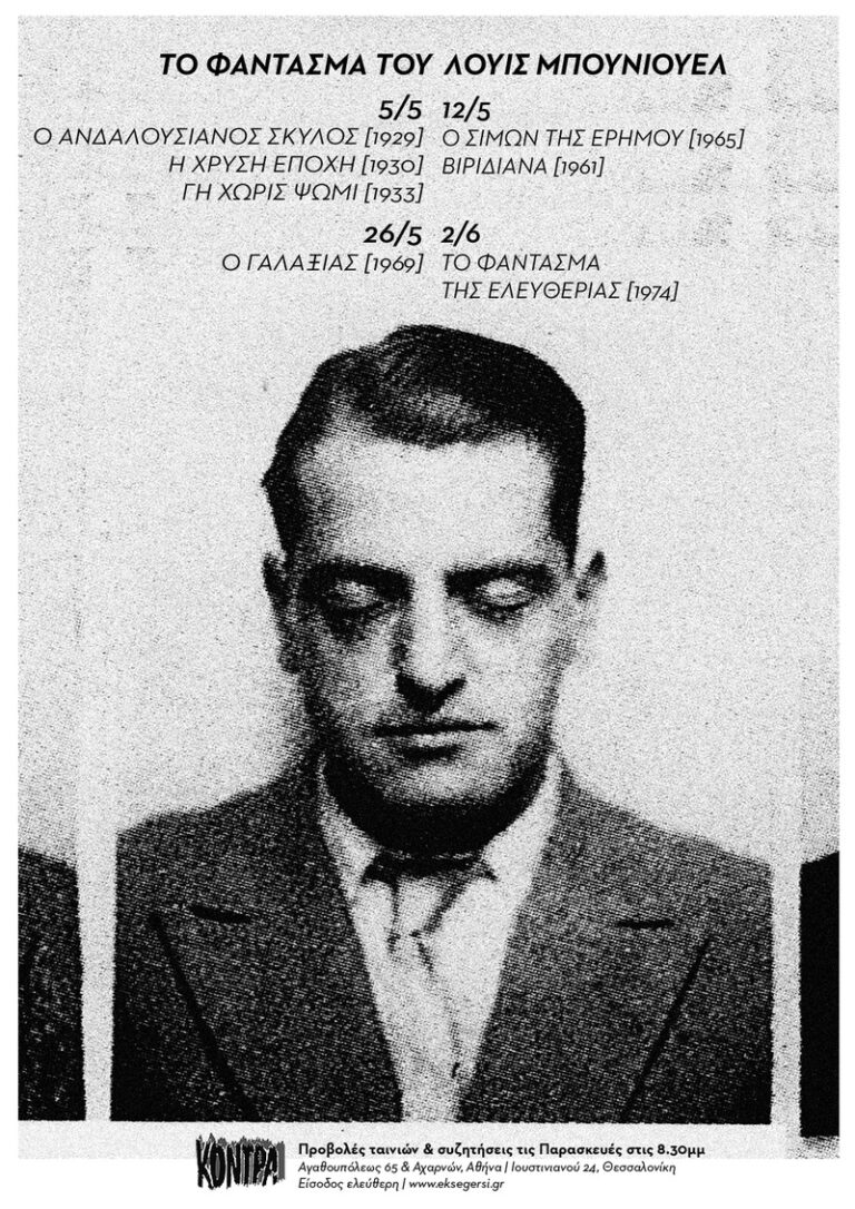 «Σε έναν κόσμο τόσο άσχημα φτιαγμένο όσο ο δικός μας, μόνο ένας δρόμος υπάρχει – η εξέγερση». Σε αυτήν του τη φράση, ο Λουίς Μπουνιουέλ (Καλάντα, 1900 – Μεξικό, 1983) συμπυκνώνει την ταραχώδη κινηματογραφική του διαδρομή, η οποία αποτυπώνεται σε 33 ταινίες που διατρέχουν έξι δεκαετίες. Γόνος μιας μεγαλοαστικής καθολικής οικογένειας της Αραγώνας, ο Μπουνιουέλ άφησε κατά μέρος τις διάφορες προσοδοφόρες και μη σπουδές του για να αφιερωθεί στον κινηματογράφο, μέσω του οποίου συνδέθηκε με το κίνημα του σουρεαλισμού. Αψηφώντας τους κανόνες της κλασικής αφήγησης, μέσα από την ονειρική συναρμολόγηση εικόνων και ήχων, συχνά ωμών και γκροτέσκων, ο Μπουνιουέλ βρήκε στον κινηματογράφο το μέσο για να προβοκάρει με υποδόριο χιούμορ τον συντηρητισμό και την υποκρισία της ιερής συμμαχίας αστικής τάξης και Εκκλησίας, αλλά και για να καυτηριάσει τις πιο σκληρές όψεις της ταξικής ανισότητας και της καταπίεσης. Οι ταινίες του συχνά απαγορεύτηκαν ή προκάλεσαν έντονη δυσφορία κατά την κυκλοφορία τους, κάτι που για τον ανατρεπτικό κινηματογραφιστή αποτελούσε και τη μεγαλύτερη επιβράβευση. Από τις πρώτες μικρού μήκους ταινίες-σκάνδαλα στη Γαλλία και το μοναδικό ντοκιμαντέρ που κινηματογράφησε στην Ισπανία, στο πέρασμά του στο Μεξικό κατά τη δικτατορία του Φράνκο κι έπειτα στην επιστροφή στα πάτρια εδάφη τη δεκαετία του ’60, μέχρι την τελευταία του γαλλική περίοδο, το αφιέρωμα αυτό επισκέπτεται σποραδικά μια απολαυστικά σκανδαλώδη διαδρομή που εξακολουθεί να στοιχειώνει τον παγκόσμιο κινηματογράφο.