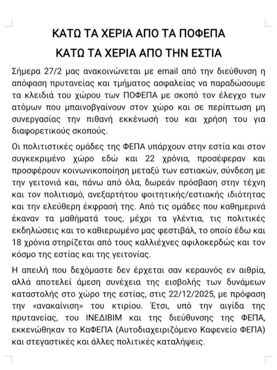 Επίθεση πλέον δέχονται και οι Πολιτιστικές Ομάδες της Φοιτητικής Εστίας Πανεπιστήμιου Αθηνών (ΠΟΦΕΠΑ). Η Διεύθυνση της ΦΕΠΑ, στις 27/2, ανακοίνωσε με e mail στις Πολιτιστικές Ομάδες ΦΕΠΑ, την απόφαση της Πρυτανείας για παράδοση των κλειδιών του χώρου, με πρόφαση τον έλεγχο όσων μπαινοβγαίνουν στον χώρο. Απειλεί δε τις ΠΟΦΕΠΑ ότι σε περίπτωση μη συνεργασίας, ο χώρος θα εκκενωθεί και θα χρησιμοποιηθεί για διαφορετικούς σκοπούς.