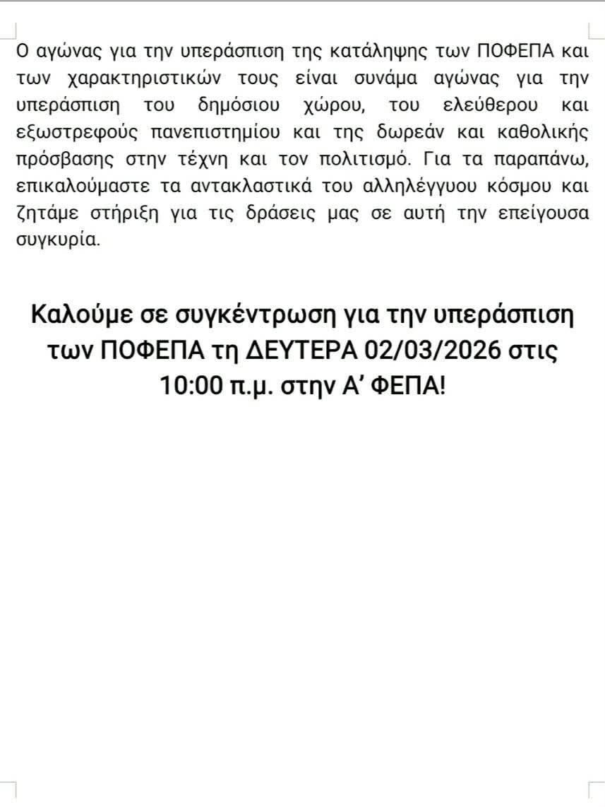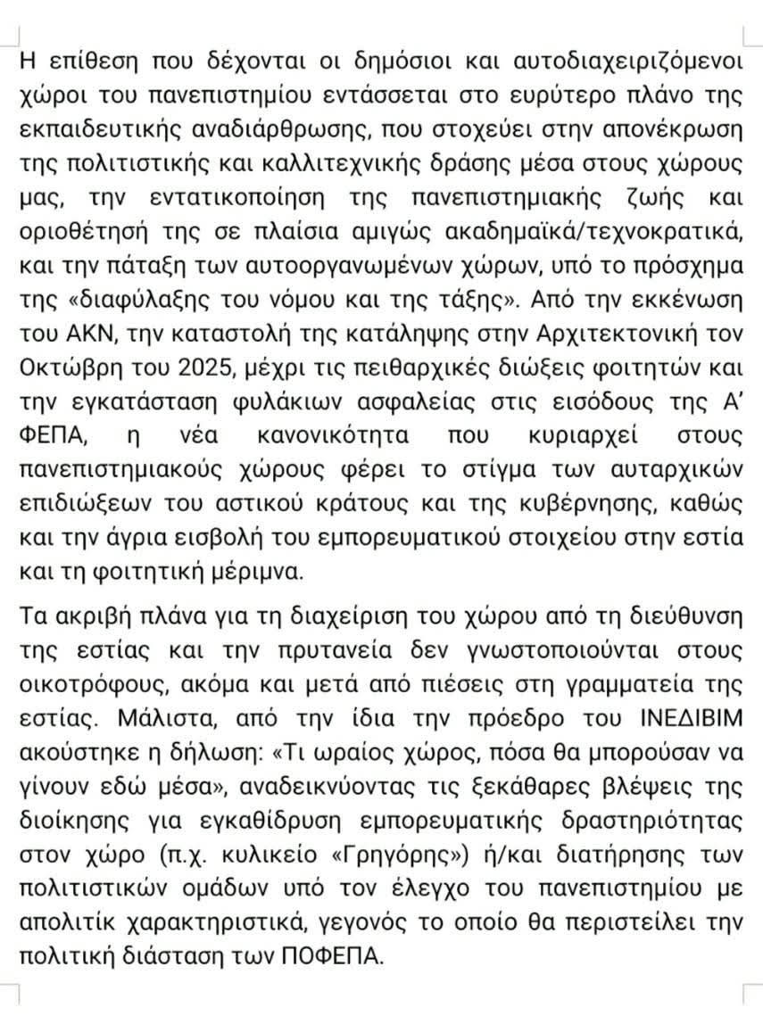 Οι ΠΟΦΕΠΑ τονίζουν ότι «η επίθεση που δέχονται οι δημόσιοι και αυτοδιαχειριζόμενοι χώροι του πανεπιστημίου εντάσσεται στο ευρύτερο πλάνο της εκπαιδευτικής αναδιάρθρωσης, που στοχεύει στην απονέκρωση της πολιτιστικής και καλλιτεχνικής δράσης μέσα στους χώρους μας, την εντατικοποίηση της πανεπιστημιακής ζωής και οριοθέτησή της σε πλαίσια αμιγώς ακαδημαϊκά/τεχνοκρατικά, και την πάταξη των αυτοοργανωμένων χώρων, υπό το πρόσχημα της διαφύλαξης ‘’του νόμου και της τάξης’’. Από την εκκένωση του ΑΚΝ, την καταστολή της κατάληψης στην Αρχιτεκτονική τον Οκτώβρη του 2025, μέχρι τις πειθαρχικές διώξεις φοιτητών και την εγκατάσταση φυλάκιων ασφαλείας στις εισόδους της Α΄ΦΕΠΑ, η νέα κανονικότητα που κυριαρχεί στους φοιτητικούς χώρους φέρει το στίγμα των αυταρχικών επιδιώξεων του αστικού κράτους και της κυβέρνησης, καθώς και την άγρια εισβολή του εμπορευματικού στοιχείου στην εστία και τη φοιτητική μέριμνα».