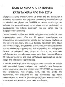 Πλοήγηση:Αρχική»Πολιτισμός»Πολιτιστικές Ομάδες Φοιτητικής Εστίας Πανεπιστημίου Αθηνών: Κάτω τα χέρια από τη δωρεάν ελεύθερη τέχνη στους δημόσιους χώρους»anakoinosi 1
