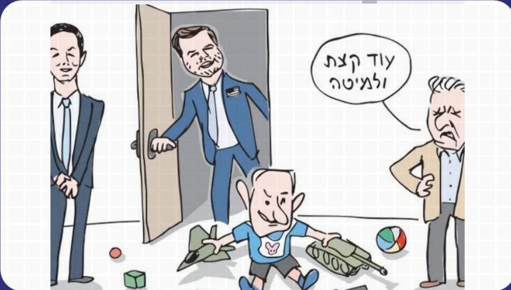 Σκίτσο σε σιωνιστικά μίντια. Ο Γουίτκοφ λέει στον… μπέμπη Νετανιάχου: «Σε λίγο πρέπει να πας για ύπνο». Παρακολουθούν ο Κούσνερ (αριστερά) και ο Τζ. Ντ. Βανς στο κέντρο. Το σκίτσο σχολιάζει τοποθέτηση του Βανς, μετά τη συνάντησή του με τον Νετανιάχου. Ο άξεστος χιλμπίλης είπε πως οι επισκέψεις των Αμερικανών στη σιωνιστική οντότητα (πρώτα πήγαν ο Γουίτκοφ με τον Κούσνερ, ακολούθησε ο Βανς και αναμένεται ο ΥΠΕΞ Ρούμπιο) αποσκοπούν στην επιτήρηση της εύθραυστης εκεχειρίας στη Γάζα και όχι στην «επιτήρηση ενός νηπίου».