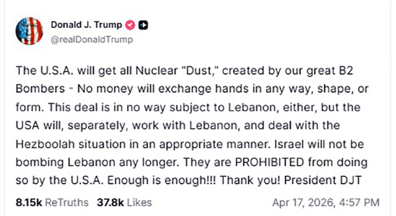«Οι Η.Π.Α. θα λάβουν όλη την πυρηνική “σκόνη” που δημιουργήθηκε από τα σπουδαία βομβαρδιστικά μας B-2 — καμία χρηματική συναλλαγή δεν θα πραγματοποιηθεί με κανέναν τρόπο, σχήμα ή μορφή. Αυτή η συμφωνία δεν σχετίζεται με κανέναν τρόπο με τον Λίβανο, ωστόσο οι ΗΠΑ θα εργαστούν ξεχωριστά με τον Λίβανο και θα αντιμετωπίσουν την κατάσταση της Χεζμπολά με τον κατάλληλο τρόπο. Το Ισραήλ δεν θα βομβαρδίζει πλέον τον Λίβανο. ΤΟΥ ΑΠΑΓΟΡΕΥΕΤΑΙ να το κάνει από τις ΗΠΑ. Αρκετά πια!!! Ευχαριστώ! Πρόεδρος DJT»