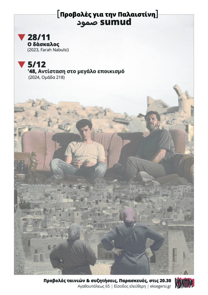 Ολοκληρώνεται σήμερα στην Κόντρα το μικρό κινηματογραφικό αφιέρωμα με τίτλο Sumud. Θα προβληθεί το ελληνικής παραγωγής ντοκιμαντέρ: ’48, Αντίσταση στο μεγάλο εποικισμό.