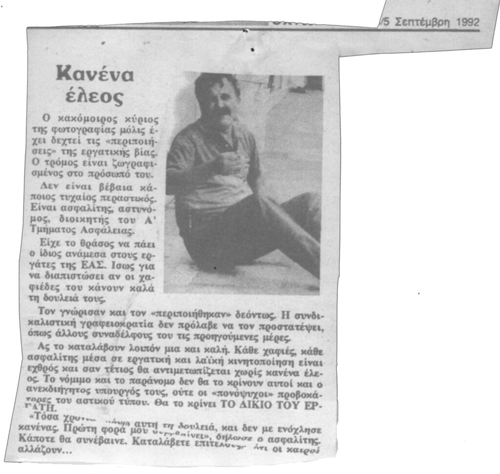 «Γιατί δεν έχουμε κίνημα ανέργων; Το εργατικό κίνημα έχει ανάγκη από μια νέα συλλογικότητα που θα κοντραριστεί με το πολιτικό και συνδικαλιστικό κατεστημένο της ολιγαρχίας. Μια συλλογικότητα που δεν θα μπορέσει να οικοδομηθεί, αν το ζήτημα της ανεργίας και των ανέργων δεν αποτελέσει ακρογωνιαίο λίθο της. Αυτό είναι ευνόητο, αν αναλογιστούμε ότι δεν μιλάμε για την παλιά “ανεργία τριβής” αλλά για εκατοντάδες χιλιάδες ανθρώπους σε παρατεταμένη ανεργία» (27-11-96)