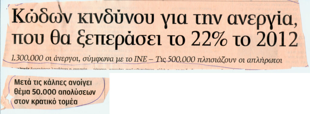 ♦Ανεξόφλητες οφειλές 2012 (πρώτο τρίμηνο) προς ΔΕΗ: αύξηση 350 εκ. ευρώ. Δηλαδή, από Δεκέμβρη 2010 (820 εκ.) στα 1160 εκ. τέλος Μάρτη 2012. Οι ανεξόφλητες οφειλές νοικοκυριών από 440 εκ. στα 760 εκ. το ίδιο διάστημα. (Πηγή: Καθημερινή, Οικονομία, 14-15/4/12). Αύξηση της φτώχειας; Μπαααα! (Ομως η απάντηση είναι μέχρι στιγμής «Μπεεεε») – Για τον συντάκτη (ή επιμελητή) του άρθρου της Καθημερινής: στην ελληνική γλώσσα οι χιλιάδες ΔΕΝ παίρνουν κόμμα αλλά τελεία…