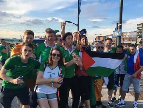 ♦ Ιρλανδοί φίλαθλοι στο ποδοσφαιρικό Euro της Γαλλίας. Φορώντας τις πράσινες μπλούζες (το χρώμα της εθνικής τους ομάδας), ποζάρουν χαμογελαστοί με τη σημαία της Παλαιστίνης, την οποία προφανώς έφεραν μαζί τους για να βγάλουν αυτή τη φωτογραφία. Ωραίοι… ως Ιρλανδοί.
