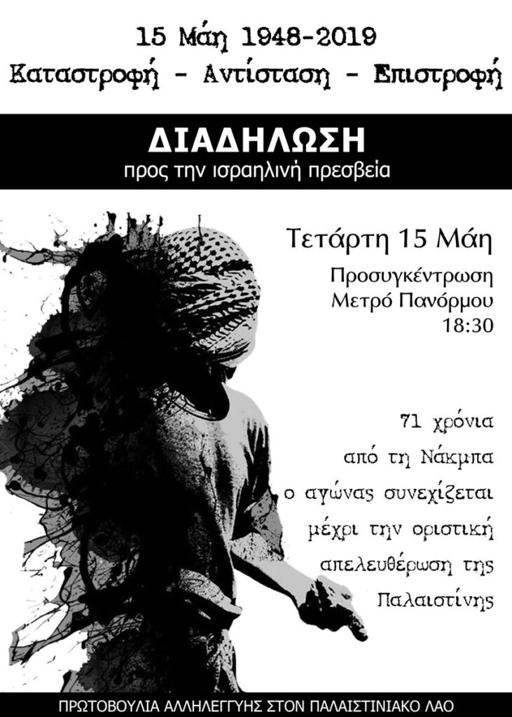 ΝΑΚΜΠΑ. Εκατοντάδες αγωνιστές, Ελληνες και Παλαιστίνιοι, τίμησαν και φέτος τη Νάκμπα, την επέτειο της μεγάλης καταστροφής, του εξανδραποδισμού του παλαιστινιακού λαού από τις πατρογονικές του εστίες το 1948.