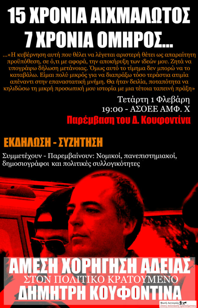 ♦ Η εκδήλωση αλληλεγγύης στον Δημήτρη Κουφοντίνα, με αιχμή την άδεια που ετσιθελικά αρνούνται να του δώσουν, απαιτώντας απ' αυτόν να υπογράψει δήλωση μετάνοιας, εκδήλωση που δεν έγινε στη Νομική τον περασμένο Δεκέμβρη, καθώς η Κοσμητεία έκλεισε τη σχολή κι όταν την άνοιξαν οι φοιτητές, η κυβέρνηση έστειλε τα ΜΑΤ να την περικυκλώσουν απαγορεύοντας την πρόσβαση, έγινε τελικά την περασμένη Τετάρτη σε αμφιθέατρο της ΑΣΟΕΕ. Ο Δ. Κουφοντίνας έκανε τηλεφωνική παρέμβαση, στην οποία εξέθεσε με σαφή και κατηγορηματικό τρόπο τις απόψεις του. Κατήγγειλε την πολιτική των κυβερνήσεων. Και της συγκυβέρνησης των ΣΥΡΙΖΑΝΕΛ, φυσικά. Συνέδεσε το ειδικό καθεστώς που έχει επιβληθεί στους πολιτικούς κρατούμενους με τη γενικότερη πολιτική των Μνημονίων, της υποταγής στους ιμπεριαλιστές δανειστές, της αμερικανοδουλείας. Και επανέλαβε ότι δεν προτίθεται να εξευτελίσει τους αγώνες του και την επαναστατική του τιμή υπογράφοντας μια ατιμωτική δήλωση μετάνοιας. Φυσικά, ξεκαθάρισε ότι την άδεια θα εξακολουθήσει να τη διεκδικεί, γιατί είναι δικαίωμα που δεν αφορά μόνο τον ίδιο, ούτε μόνο τους επαναστάτες πολιτικούς κρατούμενους, αλλά το σύνολο των κρατούμενων. Μήνυμα έστειλε ο Χρήστος Τσιγαρίδας, που η κατάσταση της υγείας του δεν του επέτρεψε να παρευρεθεί. Το μήνυμα διάβασε ο Πέτρος Γιώτης, που παρουσίασε επιγραμματικά και μερικές σκέψεις της οργάνωσής μας.