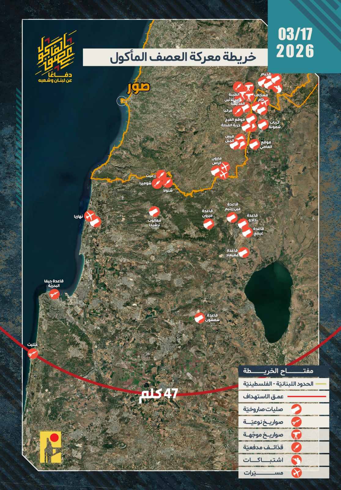 Σε υπεράσπιση του Λιβάνου και του λαού του, η Ισλαμική Αντίσταση εξέδωσε, την Τρίτη 17/03/2026, 36 στρατιωτικά ανακοινωθέντα σχετικά με επιχειρήσεις για την αντιμετώπιση των κινήσεων του «ισραηλινού» εχθρού στα λιβανοπαλαιστινιακά σύνορα, καθώς και επιχειρήσεις που στόχευσαν θέσεις, βάσεις, αναπτύξεις του «ισραηλινού» στρατού και τους οικισμούς του στη βόρεια κατεχόμενη Παλαιστίνη, ως εξής: