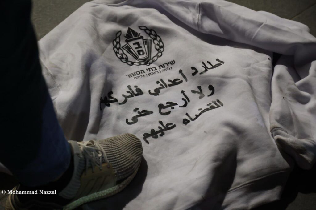 «Καταδιώκω τους εχθρούς μου, τους φτάνω και δεν επιστρέφω μέχρι να τους εξοντώσω». Αυτό ήταν το… νέο σύνθημα (φράση από το «Βιβλίο των Ψαλμών» της Παλαιάς Διαθήκης), που οι νεοναζιστές έγραψαν στα αραβικά πάνω στις μπλούζες που υποχρέωσε τους απελευθερωμένους παλαιστίνιους κρατούμενους να φορέσουν, κατάσχοντάς τους όλα τα υπόλοιπα ρούχα τους.