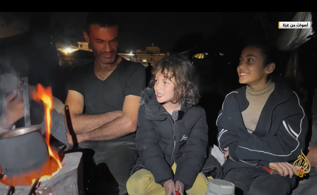 Εκπομπή «Φωνές από τη Γάζα» του Αλ-Τζαζίρα. Εκτοπισμένοι μαζεύονται κάθε βράδυ μπροστά από τη φωτιά, πίνουν τσάι, συζητούν, τραγουδούν, παίρνουν ανάσες το διάστημα μεταξύ των κυμάτων των ισραηλινών βομβαρδισμών, παρηγορήσουν ο ένας τον άλλον, κρατούν ψηλά το ηθικό τους. Στον τόπο του εκτοπισμού έχουν γίνει κάτι σαν οικογένεια.