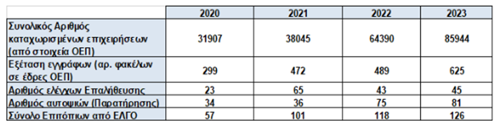 ΥΓ2. Σε ανακοίνωση του Συλλόγου Εργαζομένων του ΕΛΓΟ ΔΗΜΗΤΡΑ σχετικά με τους ελέγχους που ανακοίνωσε η πολιτική ηγεσία του ΥΠΑΑΤ υπάρχει ο παρακάτω πίνακας με τον αριθμό των διοικητικών και των επιτόπιων ελέγχων που διενήργησε ο ΕΛΓΟ ΔΗΜΗΤΡΑ στους πιστοποιητικούς οργανισμούς και στους παραγωγούς βιολογικών προϊόντων την τετραετία 2020–2023.