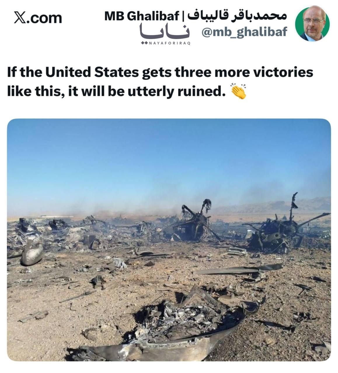 Ακολούθηκε ένα τουίτ-μαχαιριά του προέδρου της Ιρανικής Βουλής, Μοχάμαντ Μπαγέρ Γαλιμπάφ: «Αν οι ΗΠΑ πετύχουν άλλες 3 νίκες αυτού του είδους, το τέλος τους θα είναι αναπόφευκτο».