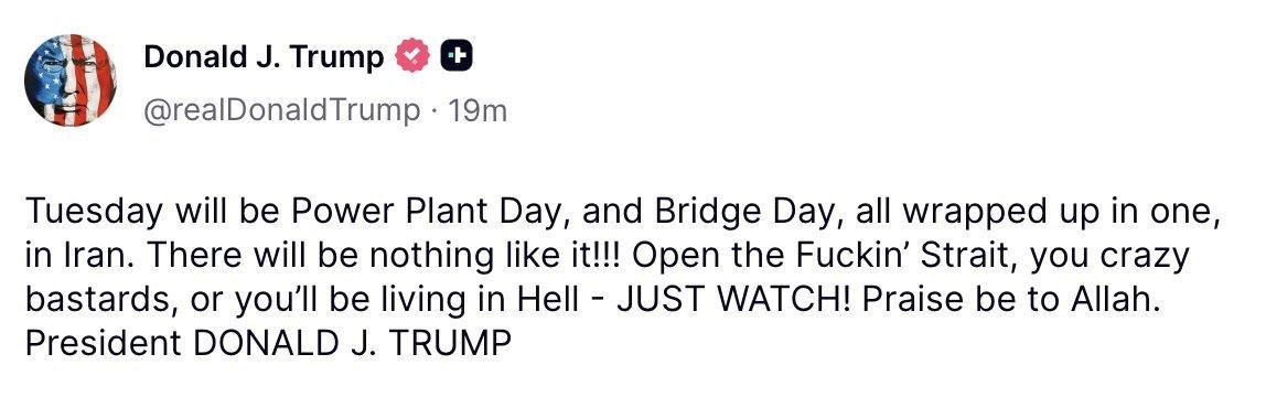«Η Τρίτη θα είναι Ημέρα Εργοστασίων Ηλεκτρικής Ενέργειας και Ημέρα Γεφυρών, όλα μαζί σε ένα, στο Ιράν. Δεν θα υπάρξει τίποτα όμοιό της!!! Ανοίξτε το γαμημένο Στενό, ρε τρελοί μπάσταρδοι, αλλιώς θα ζείτε στην Κόλαση — ΑΠΛΩΣ ΚΟΙΤΑΞΤΕ! Δόξα στον Αλλάχ. Πρόεδρος ΝΤΟΝΑΛΝΤ ΤΖ. ΤΡΑΜΠ.»