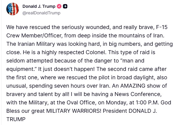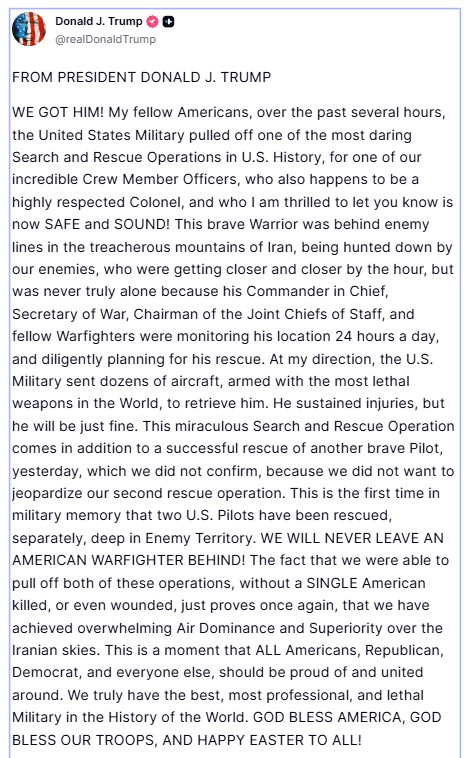 «Διασώσαμε τον σοβαρά τραυματισμένο και πραγματικά γενναίο Μέλος Πληρώματος F-15/Αξιωματικό, από βαθιά μέσα στα βουνά του Ιράν. Ο Ιρανικός Στρατός τον αναζητούσε έντονα, σε μεγάλους αριθμούς, και πλησίαζε. Είναι ένας αξιοσέβαστος Συνταγματάρχης. Τέτοιου είδους επιδρομή σπάνια επιχειρείται λόγω του κινδύνου για “άνθρωπο και εξοπλισμό”. Απλώς δεν συμβαίνει! Η δεύτερη επιδρομή ήρθε μετά την πρώτη, κατά την οποία διασώσαμε τον πιλότο μέρα μεσημέρι, κάτι επίσης ασυνήθιστο, παραμένοντας επτά ώρες πάνω από το Ιράν. Μια ΚΑΤΑΠΛΗΚΤΙΚΗ επίδειξη γενναιότητας και ικανότητας από όλους! Θα πραγματοποιήσω Συνέντευξη Τύπου, μαζί με τον Στρατό, στο Οβάλ Γραφείο, τη Δευτέρα, στη 1:00 μ.μ. Ο Θεός να Ευλογεί τους σπουδαίους ΠΟΛΕΜΙΣΤΕΣ ΤΟΥ ΣΤΡΑΤΟΥ μας! Πρόεδρος ΝΤΟΝΑΛΝΤ ΤΖ. ΤΡΑΜΠ»