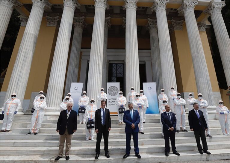 Πατούλης και Αρκουμανέας «υπέγραψαν Σύμφωνο, που επικυρώνει τη συνεργασία Ιατρικού Συλλόγου Αθηνών, Περιφέρειας Αττικής και Εθνικού Οργανισμού Δημόσιας Υγείας». Παρουσία καμερών, φυσικά. Γι’ αυτό, άλλωστε, πήγαν στο Ζάππειο. Γι’ αυτό έντυσαν γιατρούς και νοσηλευτές με στολές εργασίας και τους έστησαν σαν γλάστρες πίσω τους.