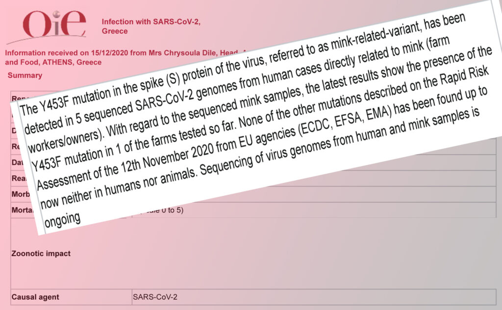 Εχουμε, λοιπόν, επίσημη επιβεβαίωση της ανεύρεσης μέχρι στιγμής πέντε στελεχών συγκεκριμένης μετάλλαξης του SARS-CoV-2, που πέρασε από μινκ σε άνθρωπο. Και βέβαια, πανηγυρική επιβεβαίωση των αποκαλύψεων της ΚΟΝΤΡΑ-eksegersi.gr, χωρίς τις οποίες το ζήτημα θα θαβόταν. Απόδειξη, το γεγονός ότι μολονότι το ξέρουν από τις 8 Δεκέμβρη, ενημέρωσαν τον ΟΙΕ μόλις στις 15 Δεκέμβρη, ενώ στον ελληνικό λαό δεν έχουν πει ακόμα τίποτα.