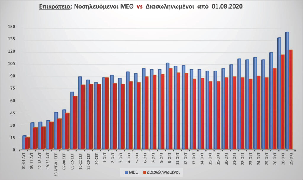 Οι διασωληνωμένοι στις ΜΕΘ στις 16 Σεπτέμβρη ήταν 237, στις 29 Οκτώβρη 1.569 και στις 2 Νοέμβρη 2.243.