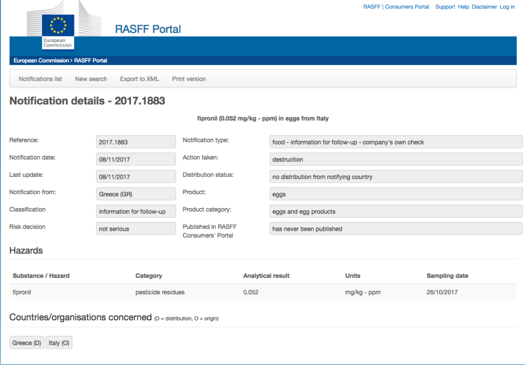 Το σχετικό σήμα (alert) στο πόρταλ του RASFF έχει ημερομηνία 8 Νοέμβρη και προέρχεται από την Ελλάδα. Σε αυγά προέλευσης Ιταλίας ανιχνεύτηκε Fipronil σε συγκέντρωση 0,05 mg/kg-ppm. Η ανίχνευση έγινε σε δείγμα που πάρθηκε στις 26 Οκτώβρη, στο πλαίσιο ελέγχου που έγινε από την επιχείρηση παραγωγής (στην Ιταλία δηλαδή, όχι στην Ελλάδα). Εγινε καταστροφή, αναφέρει το σήμα, χωρίς να διευκρινίζει αν τμήμα των προϊόντων είχε ήδη διανεμηθεί και καταναλωθεί.