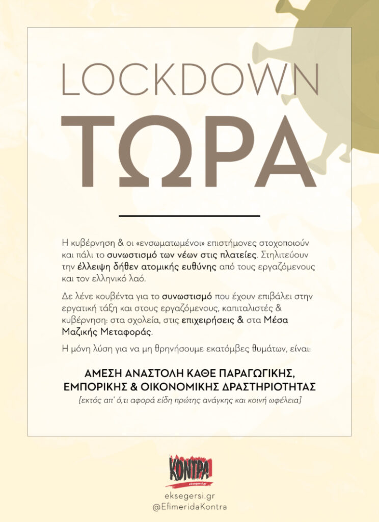 Η μόνη λύση, για να μη θρηνήσουμε εκατόμβες θυμάτων, είναι το γενικό lockdown ΤΩΡΑ. Οχι, φυσικά, με τους όρους της κυβέρνησης Μητσοτάκη, αλλά με τους όρους που θέτουν οι ταξικά συνειδητοποιημένοι εργαζόμενοι-συνταξιούχοι-νεολαίοι.