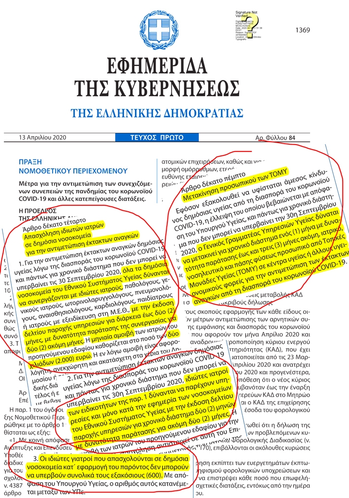 - Ο γενικός γραμματέας του υπουργείου Υγείας μπορεί να μετακινεί γιατρούς και νοσηλευτές από ΤΟΜΥ (Τοπικές Μονάδες Υγείας) σε κέντρα υγείας ή νοσοκομεία, για διάστημα που μπορεί να φτάσει τους τρεις μήνες.